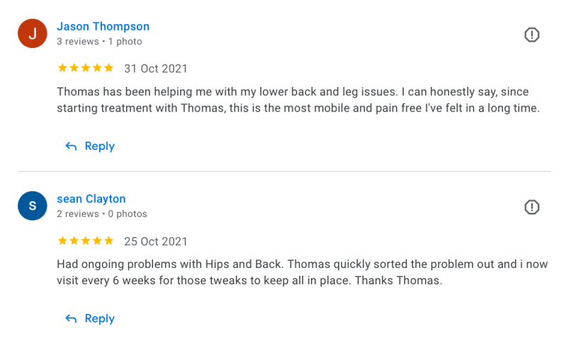 “Thomas è riuscito ad aiutarmi con il mio problema alla lombare e alla gamba (sciatica). Posso onestamente dire che, sin da quando ho iniziato il corso di trattamenti con Thomas, è stato il periodo con meno dolore e piu' mobilita' che ho percepito da molti anni”